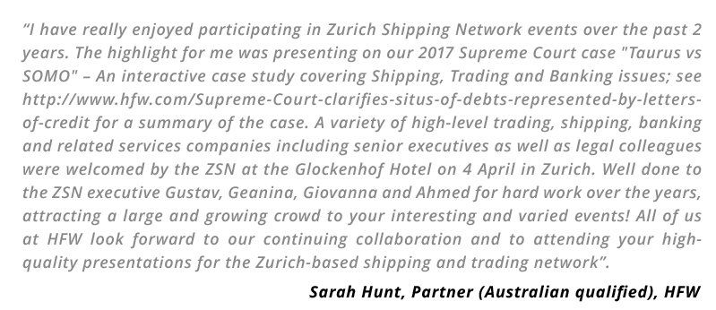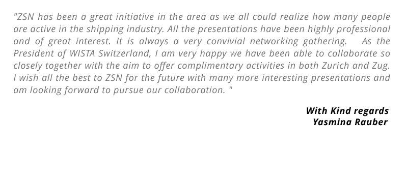"ZSN has been a great initiative in the area as we all could realize how many people are active in the shipping industry. All the presentations have been highly professional and of great interest. It is always a very convivial networking gathering. As the President of WISTA Switzerland, I am very happy we have been able to collaborate so closely together with the aim to offer complimentary activities in both Zurich and Zug. I wish all the best to ZSN for the future with many more interesting presentations and am looking forward to pursue our collaboration. "
