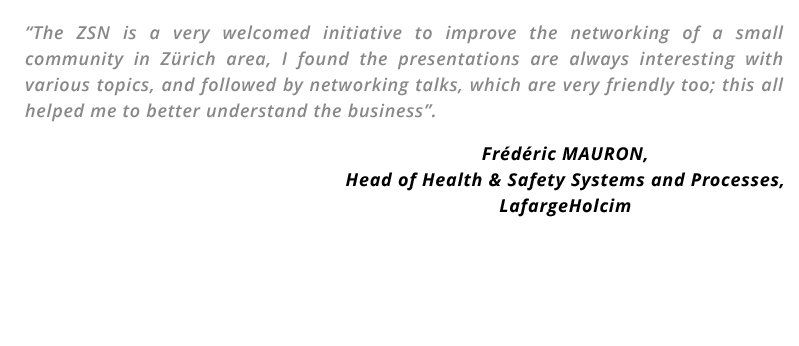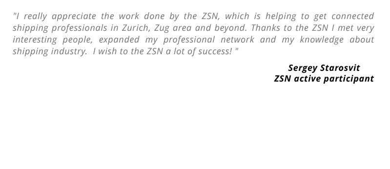 "I really appreciate the work done by the ZSN, which is helping to get connected shipping professionals in Zurich, Zug area and beyond. Thanks to the ZSN I met very interesting people, expanded my professional network and my knowledge about shipping industry. I wish to the ZSN a lot of success! "