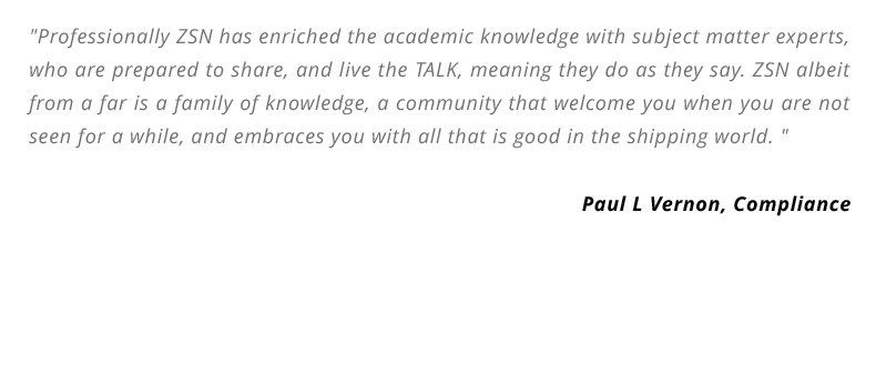 "Professionally ZSN has enriched the academic knowledge with subject matter experts, who are prepared to share, and live the TALK, meaning they do as they say. ZSN albeit from a far is a family of knowledge, a community that welcome you when you are not seen for a while, and embraces you with all that is good in the shipping world. "
