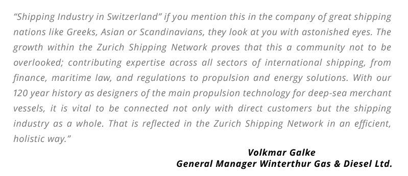 “Shipping Industry in Switzerland” if you mention this in the company of great shipping nations like Greeks, Asian or Scandinavians, they look at you with astonished eyes. The growth within the Zurich Shipping Network proves that this a community not to be overlooked; contributing expertise across all sectors of international shipping, from finance, maritime law, and regulations to propulsion and energy solutions. With our 120 year history as designers of the main propulsion technology for deep-sea merchant vessels, it is vital to be connected not only with direct customers but the shipping industry as a whole. That is reflected in the Zurich Shipping Network in an efficient, holistic way.”